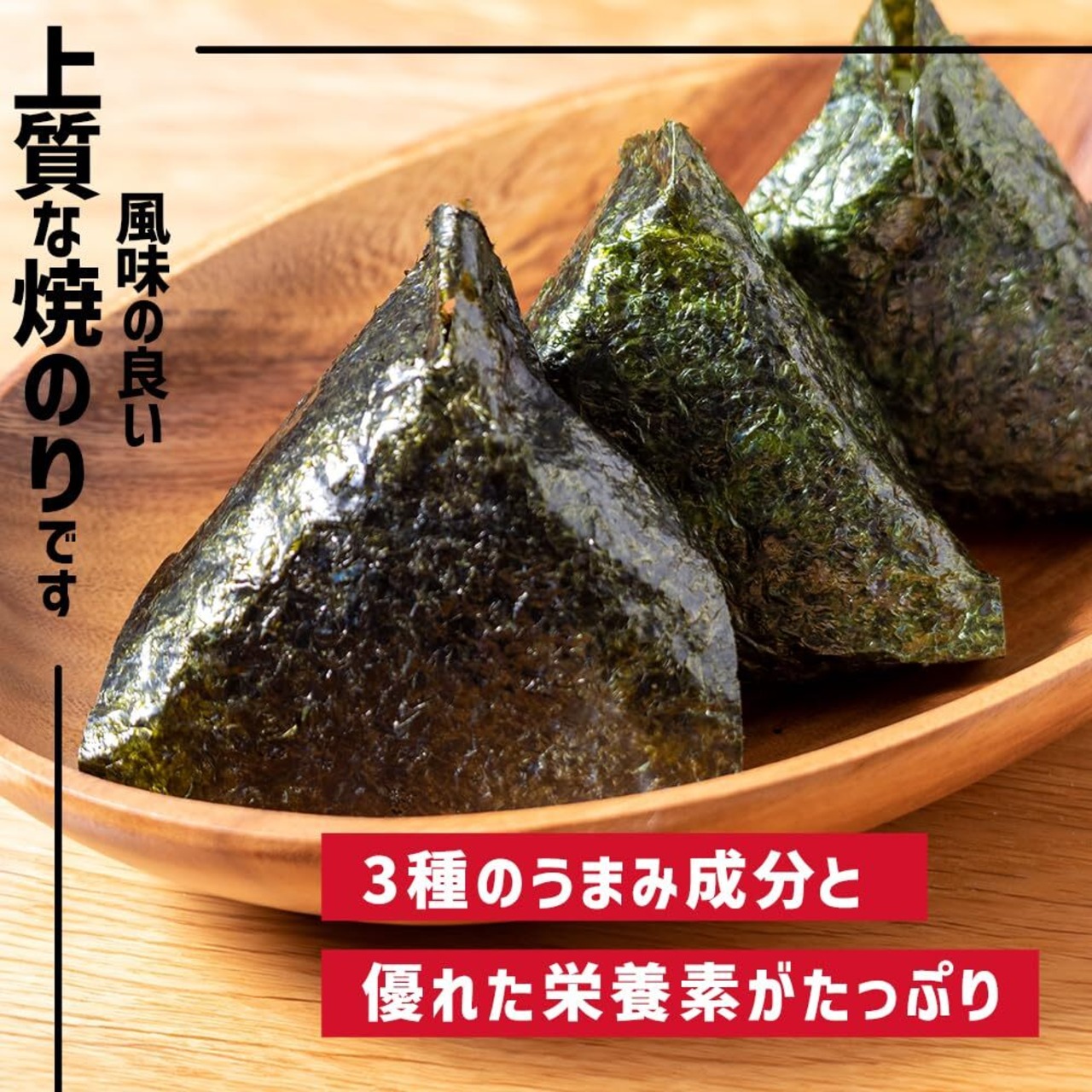 おにぎりやおもちに最適な1/3切サイズの焼のり。海苔をカットする手間がないので毎日のおにぎりつくりも楽々。細かく刻んでお蕎麦やちらし寿司にも。