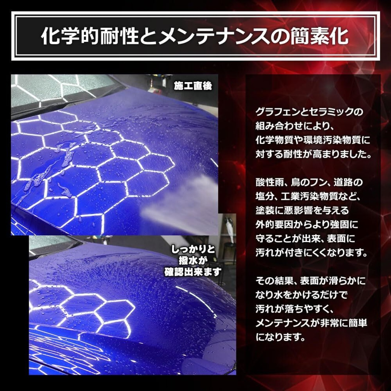 グラフェンが柔軟である為、トップアップして、レイヤード施工が可能。耐久性能・撥水性能・スリック性・防汚性能の全てが向上します。