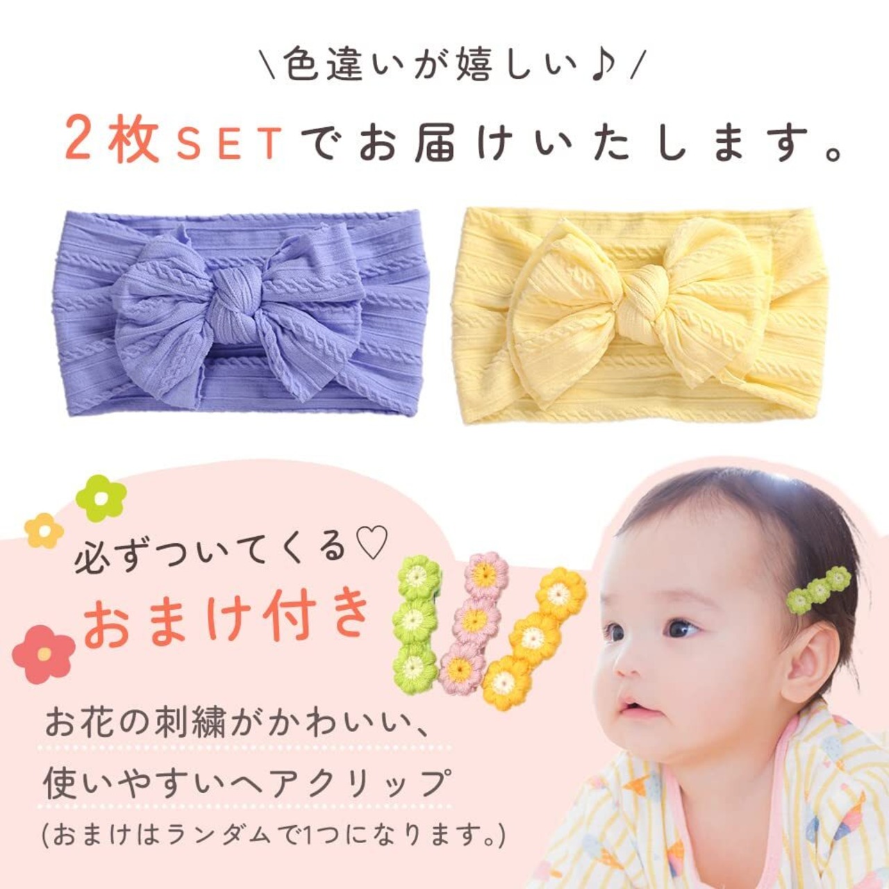 【必ず付いてくる!かわいいおまけのヘアクリップ付き】ヘアバンド2枚に加え、かわいい花モチーフのヘアクリップが1点付属(ランダム)。お出かけや撮影、兄弟姉妹とのおそろいコーデにも使えるアクセントとして活躍します。クリップは滑りにくく、細く柔らかい赤ちゃんの髪の毛もしっかりキャッチ。さりげないワンポイントに最適で、普段使いから特別なイベントまで幅広くご使用いただけます。おまけとは思えないクオリティで、ママたちの間でもリピーター続出の人気アクセサリーです