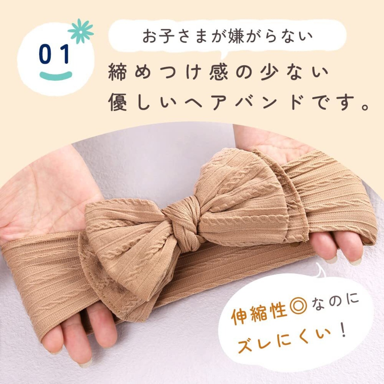 【伸縮性バツグンで快適なつけ心地、締めつけずズレにくい】赤ちゃんの繊細な頭にもフィットする、柔らかく伸縮性のある素材を使用。長時間つけても不快感が少なく、ズレにくい構造だから、動き回るお子さまにも安心してご使用いただけます。通気性にも優れており、汗ばむ季節でもムレにくく、季節を問わず使用可能。敏感肌のお子さまにもやさしい生地感で、デリケートなお肌にも安心してお使いいただけます。快適さと可愛さを両立した、デイリーユースにぴったりのベビーヘアバンドです