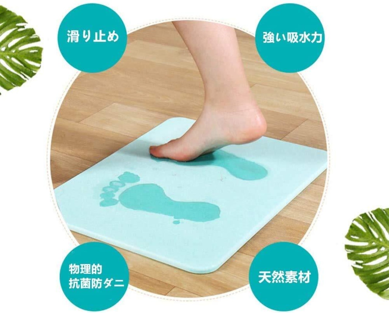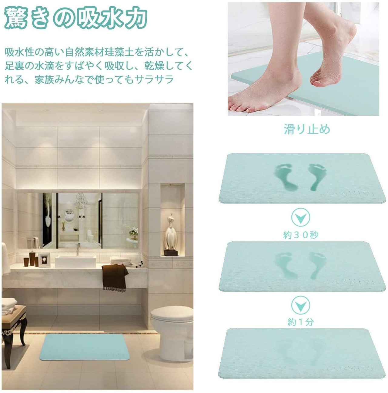 【抗菌材質・消臭効果】「調湿」機能で不衛生なバイ菌やカビ菌、ダニなどの繁殖を防ぐことができ、室内のいやな臭いを吸着「消臭作用」も持っています。そのおかげで、浴室、脱衣所、洗面所、キッチンや玄関など、活躍場所は家の中にたくさんあります。また、使用回数や経年変化により表面の目が詰まり、吸水力が低下することがあります。その場合は、付属の紙ヤスリまたは市販の紙ヤスリで表面を軽く磨くと、吸水力を回復させることができます。