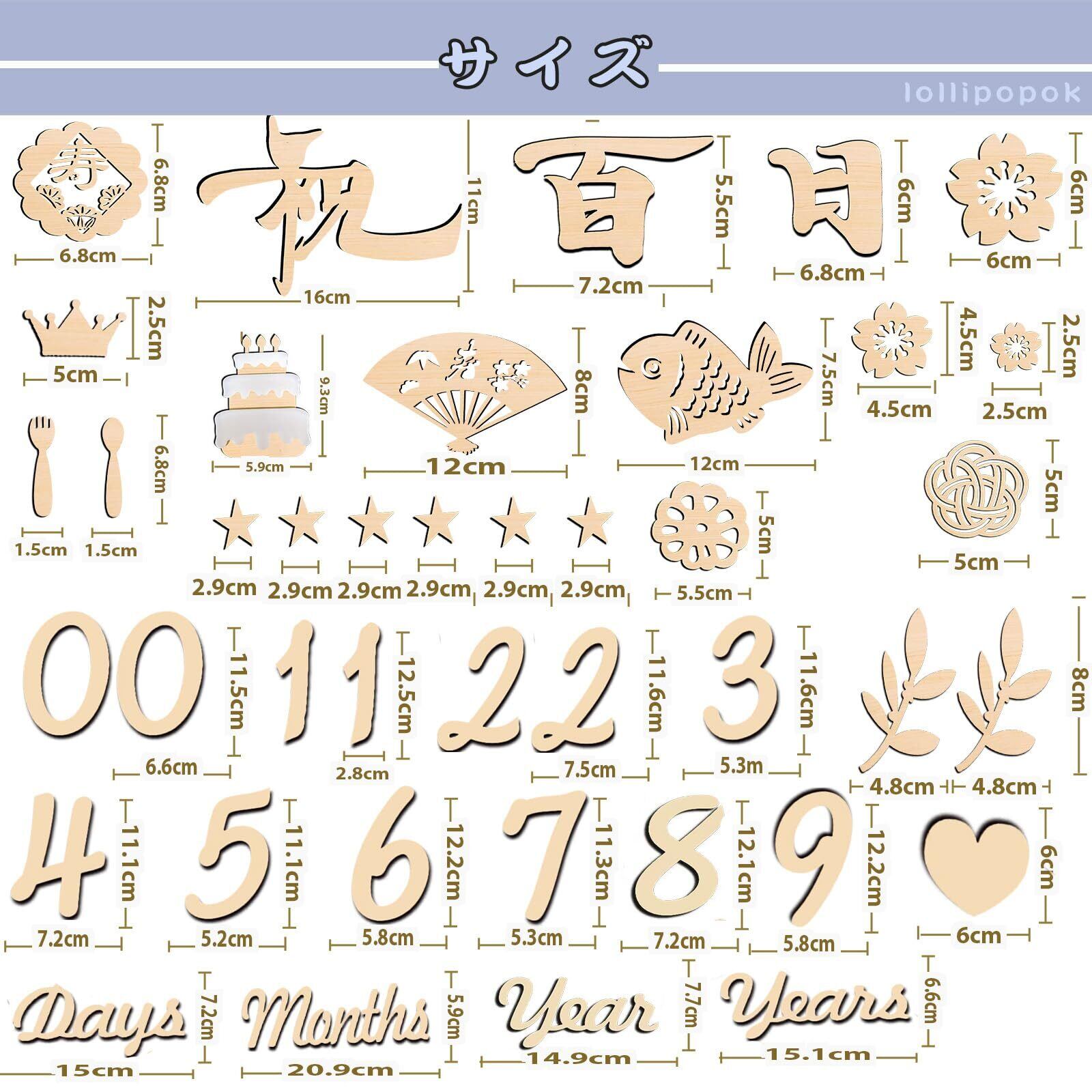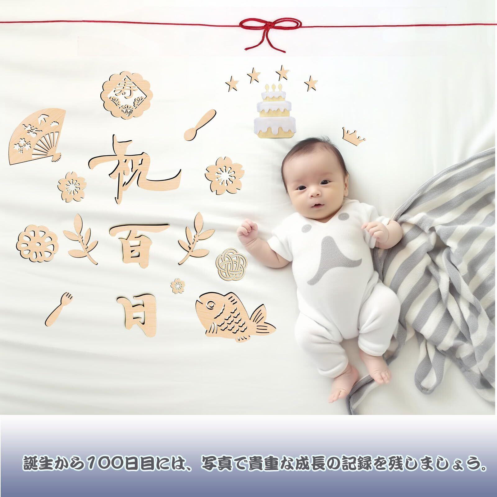 【セット内容】:合計43枚、0-9の数字、days、weeks、months、years 、100 days birthday、祝、百、日、魚、寿、ケーキ、王冠、梅結び、扇子、飾りの葉、星、赤の紐などがあります。