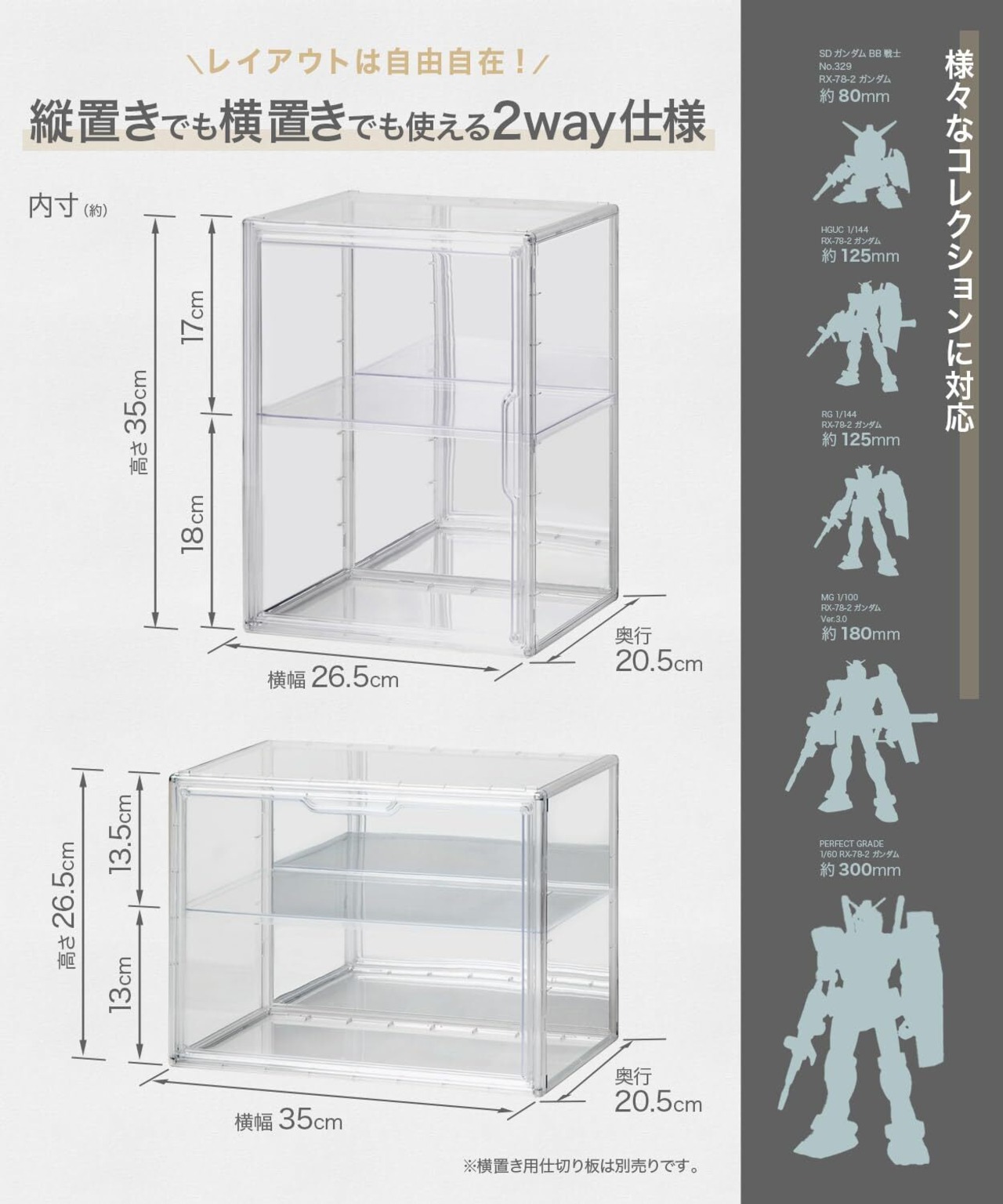 【レイアウト自由】7段 階 の 高さ 調整が可能。仕切り板 が付いているから、様々なフィギュア や コレクション ガンプラ に対応しています。抜群の使い勝手です。