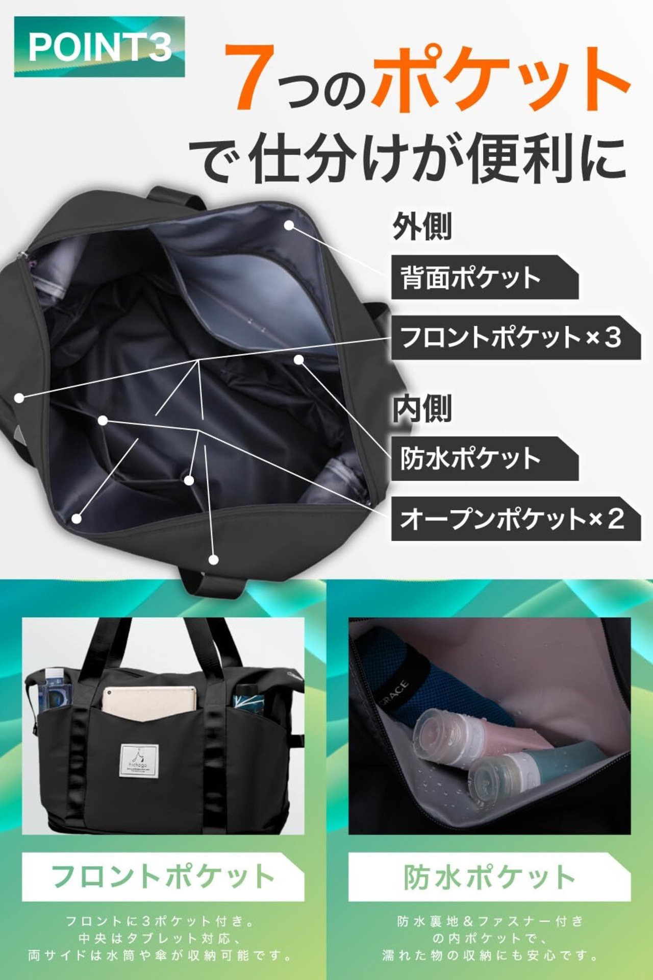 【豊富な収納ポケット】合計5つの収納(メイン収納・乾湿分離ポケット・小物ポケット・背面ポケット・フロントポケット)がありバックで迷子になりがちな小物類も使いやすく整理整頓。乾湿分離ポケットは防水性のあるポケットで濡れたタオルや洗面用具などを入れることで衣類なのが濡れる心配がなくなります。水泳や海水浴、温泉などに持っていくバッグとしてもおすすめ。