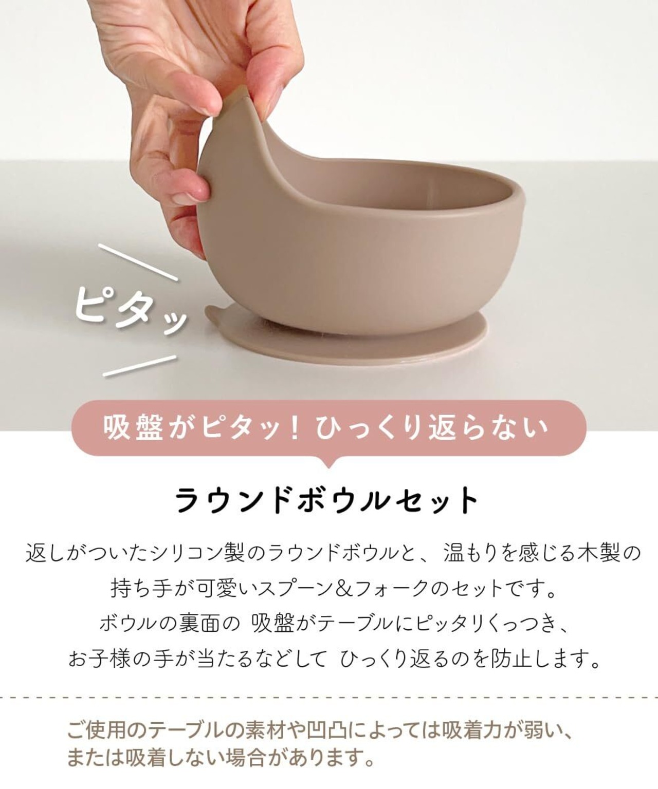 ボウルの裏面の吸盤がテーブルにピタッ!ひっくり返りを防止。取り外しは、吸盤に付いているツマミを引っ張るだけ。
