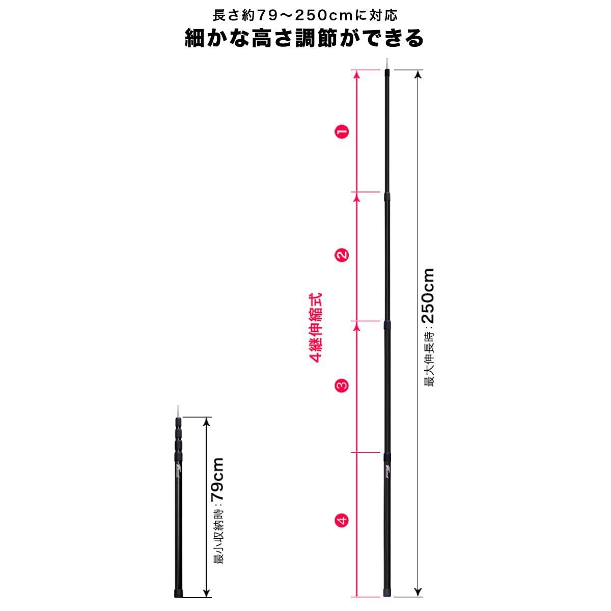 【細かな高さ調節ができる】 4つのシャフトを重ねた4継無断階調節式を採用。高さは79~250cmの間でお好みの高さに設定できます。また収納時もコンパクトに収まるので持ち運びラクラク!
