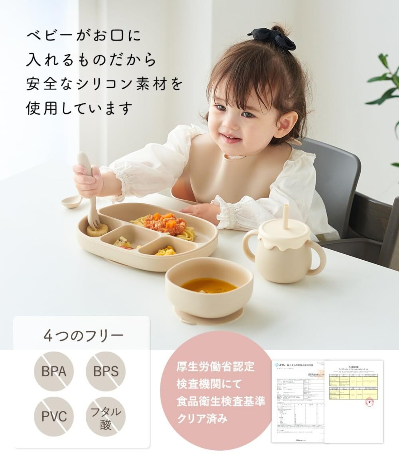 【食品衛生検査基準クリア済み】赤ちゃんがお口に入れるものだから安全なシリコン素材を使用しています。BPA、BPS、PVC、フタル酸不使用。