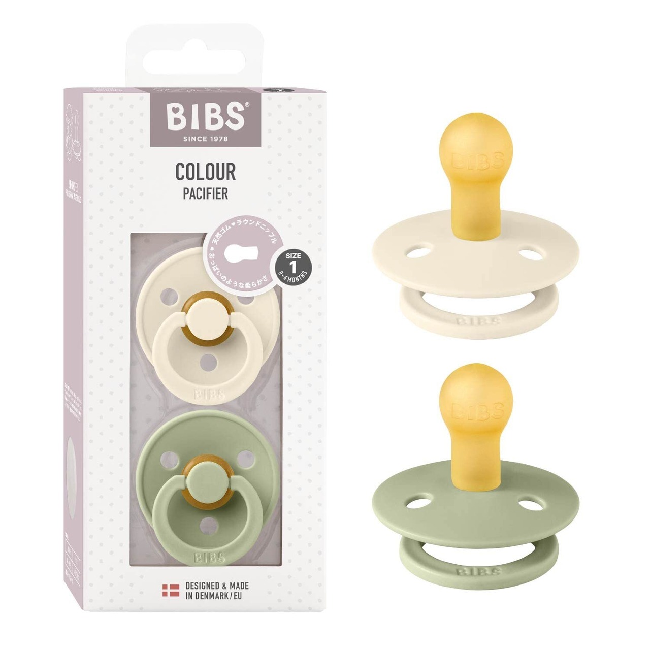 BIBS(ビブス) 天然ゴムおしゃぶり 2個セット COLOUR サイズ1(0~6カ月)【日本正規品】BPAフリー アーチ形状で摩擦を軽減 胸に似た丸型ニップル 110241 Ivory/Sage