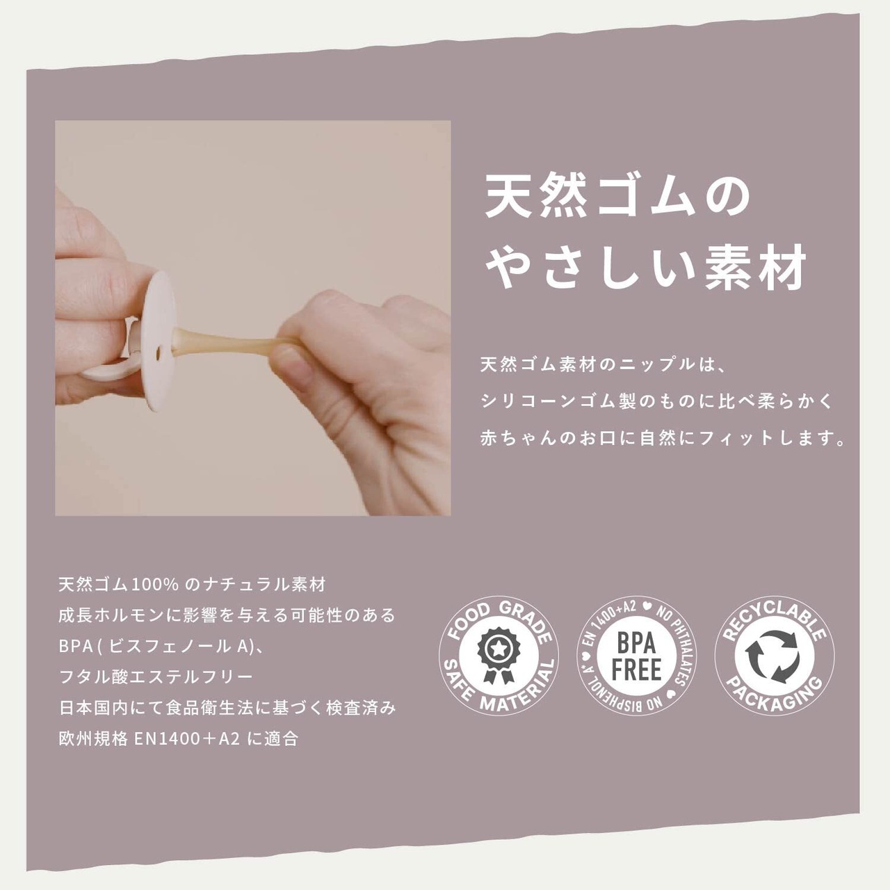 煮沸・薬液・レンジ消毒はできません。・ラテックスは天然素材のためニップル部分に色の個体差がある場合がございますが 品質に問題はございませんのでご安心ください。 (例:模様がある、部分的に白いなど) また、紫外線や唾液、熱で徐々に劣化します。天然ゴムラテックスは体質によってはアレルギー反応を起こすことがあります。異常が見られた場合はすぐに使用を中止し、かかりつけ医にご相談ください。