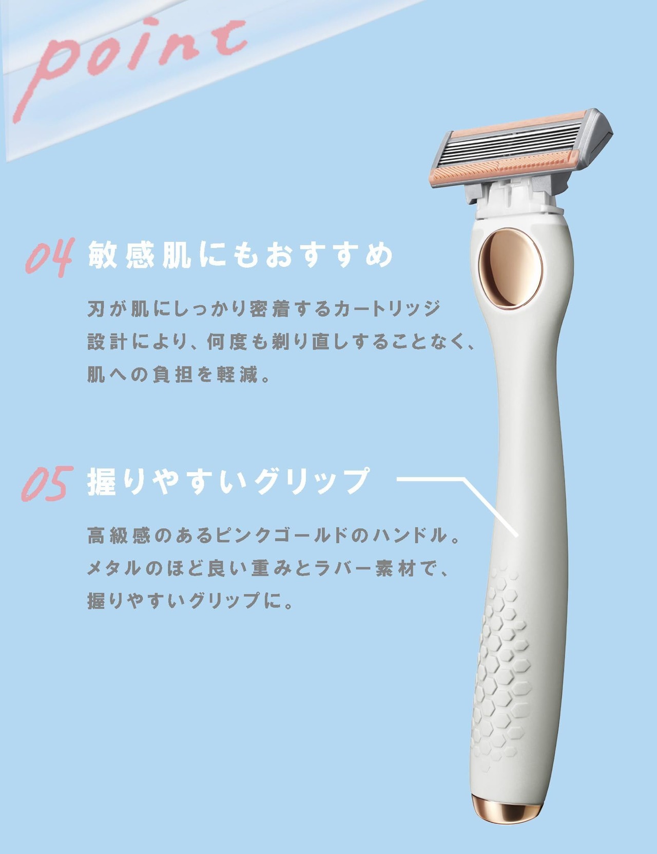 「6枚刃で角質もやさしくケア。透明感あふれる素肌へ。」