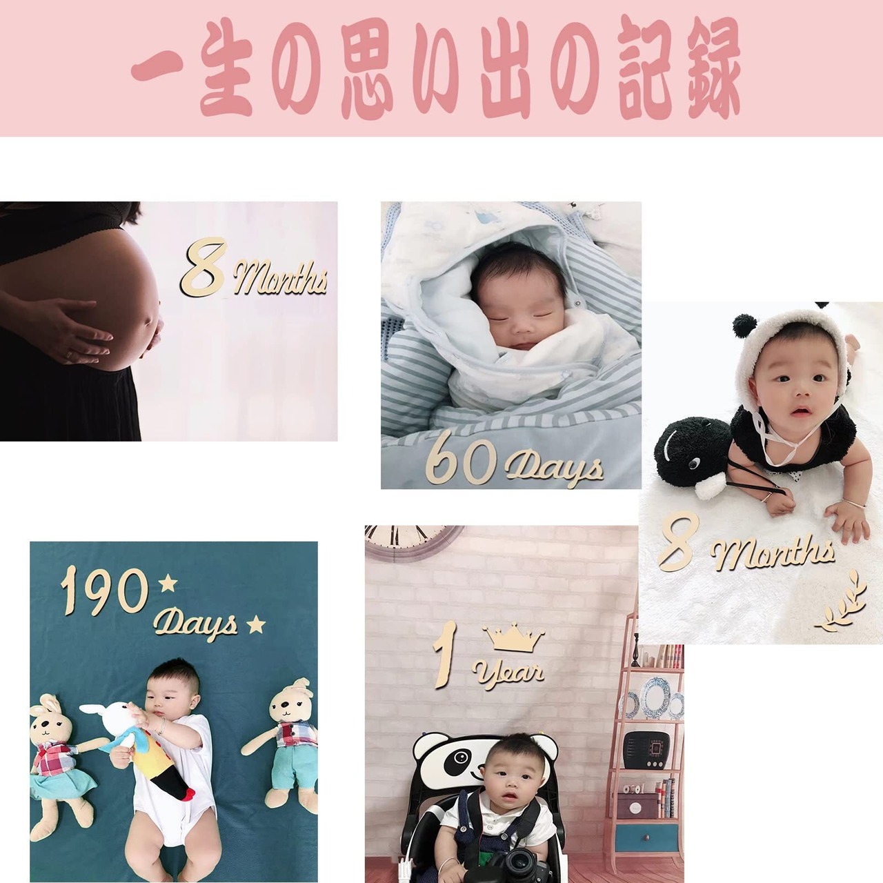 【セット内容】合計59枚、0-9の数字、day(s)、week(s)、month(s)、year(s) 、happy birthday、just born、100 days birthday、飾りの葉、飾りの花、星、ハート、羽、王冠、月、体重測定(kg)、身長測定(cm)などがあります。また、収納袋付きで利用後の片付けも簡単です。