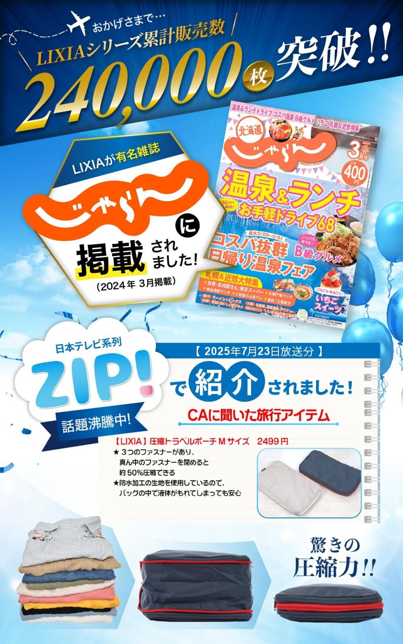 【ファスナーを閉めるだけで簡単圧縮】 かさばる衣類があっという間にスッキリ!衣類を畳んで納め、チャックを閉めるだけで約50%圧縮できるバッグです。是非LIXIAの圧縮バッグで荷物に囚われない旅行をお楽しみください!