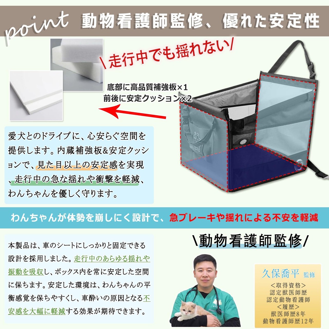 【動物看護師監修だから安心!ゆったり寛げるドライブシート】 NooyaStyle ペットドライブシートは、動物看護師さんの専門的な知見を取り入れて開発されました。何よりも大切にしたのは、大切なご家族であるワンちゃん、ネコちゃんが車内でも「ホッとできる」空間であること。しっかりとした造りが、揺れる車内でもペットを安定させ、まるで自宅のようにリラックスできる環境を作り出します。予期せぬ急ブレーキやカーブでの不安を和らげ、心穏やかに、快適なドライブを体験していただけます。愛犬との『くるま旅』が、より安心で楽しい思い出になりますように。