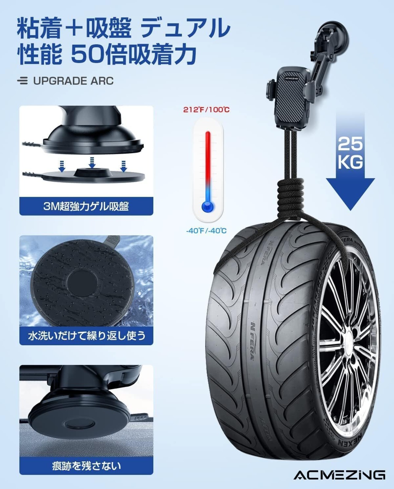 【2in1スマホホルダー 車・安定感抜群】史上に前例のない組み合わせが新登場!ACMEZINGは何千件のアンケート調査、TOP100製品の問題を解析により、日本の運転者に最も適したフック式+粘着ゲル吸盤型車載ホルダーを開発しました。従来のエアコン吹き出し口クリップ式とは異なり、超強力ステンレス鋼製のフック式スマホホルダーはより安定し、あらゆる車で手元に近づけた操作が可能です。さらに、弊社の車用スマホホルダー吸着盤には特殊なゲルを採用、抜群な吸着力でダッシュボード、フロントガラスにしっかりと固定、オフロードでも落ちません。ご注意:カー用品 スマホホルダーはワイヤレス充電を搭載していないため、充電にはケーブルの接続が必要です。