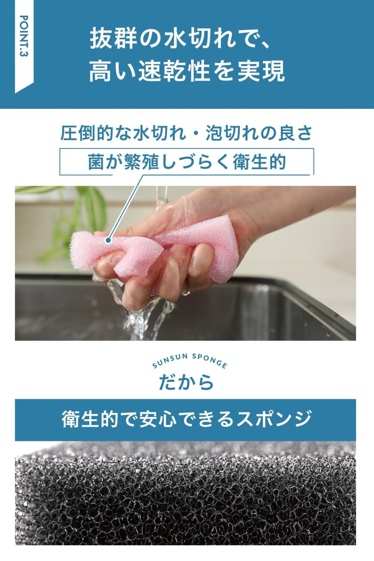 【選ばれる理由】高品質ポリウレタンを使用し、ギュッと絞るだけで 水切れ スッキリ!膜飛ばし構造により、もこもこな 泡立ち と 泡切れ を実現。 速乾性 に優れ、臭いが残りにくい設計です。 研磨剤不使用 なので、プラスチック、ガラス、メラミン食器でも傷つけず安心して使えます。
