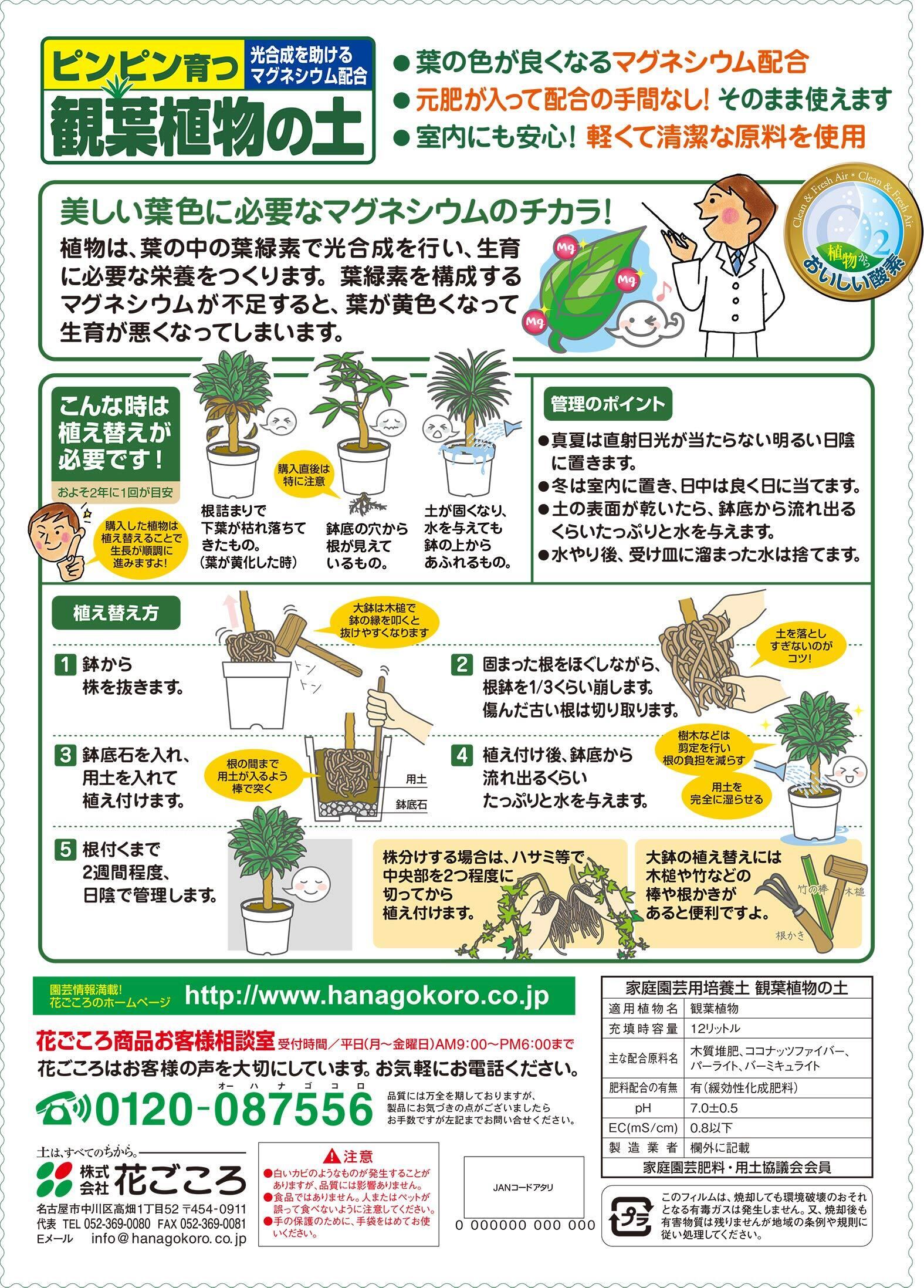 光合成を助けるマグネシウムを配合した、観葉植物にぴったりの土です。年1度の鉢替えの際にお使いください。観葉植物が生き生きと、大きく成長します。また、挿し木や株分けにもお使いいただけます。主原料:木質堆肥、バーミキュライト、軽石、ピートモス※緩効性化成肥料も含まれております。○使用方法(植え替え方)鉢から株を抜き固まった根をほぐしながら根鉢を1/3くらい崩し、痛んだ古い根を切り取ります。鉢底土、用土を入れ植え付けたら鉢底から流れ出るくらいたっぷりと水を与えます。根付くまで2週間程度日陰で管理します。