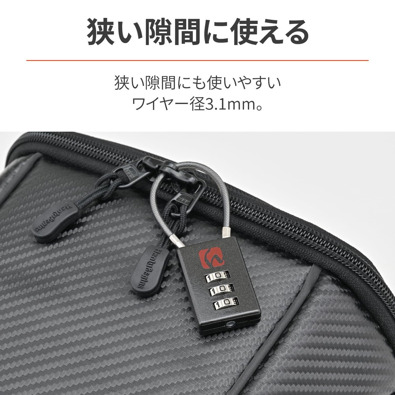 ワイヤーをファスナー穴に通すことでロックが可能です。