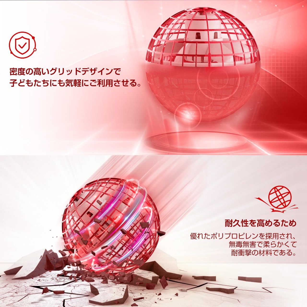 【優れた材料と独特なデザインの両立】耐久性を高めるため優れたポリプロピレンを採用され、無毒無害で柔らかくて耐衝撃材料である。軽く柔軟性のある作りなので落ちても壊れない。コントローラーを使用せず、赤外線で四方を感知して自動で飛んでくれるフライングボールであり、手を近づけたり、壁に近づいたら反対方向へ飛んでくれるので簡単に飛ばせて遊べる。中央のLEDが色を変えて点滅し綺麗で、夜に遊びるとアステロイドのような輝いているフライングボールは手中で回転する。