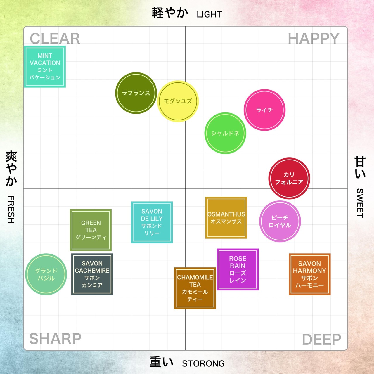 【ラフランスを主体としたフルーツガーデンを思わせるフルーティーフローラル】爽やかさと華やかさが共存するラフランスを主体としたフルーティーフローラルノート。甘酸っぱいアップルと完熟なラフランスの果肉感溢れる甘く爽やかな芳香を、リーフグリーンやミュゲなどの草花がナチュラルに引き立てます。柔らかなムスクが包み込み、官能的なラフランスが安心感と心地よい余韻をもたらします。