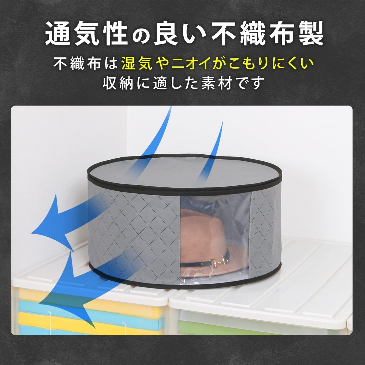 【商品仕様】:サイズ/約直径47×高さ22cm、カラー/グレー、内容/1個、収納目安/帽子:約4~5個、材質/ポリプロピレン・活性炭・ポリエチレン