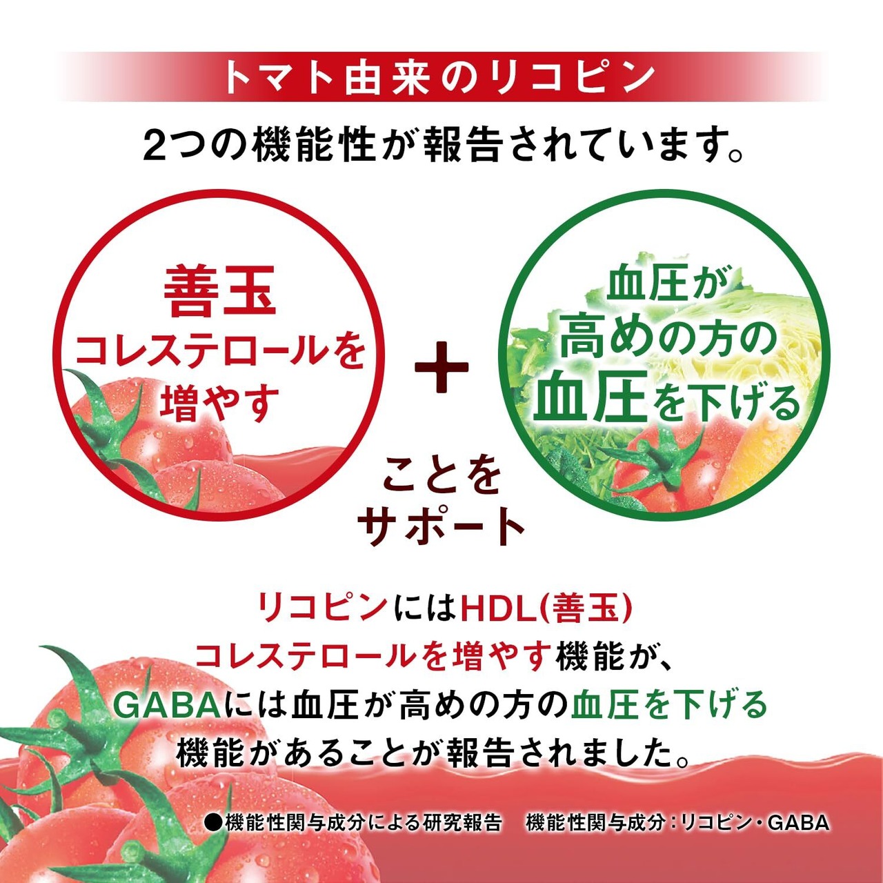 血中コレステロールが気になる方に-トマト由来のリコピン-、血圧が高めの方に-トマト由来のGABA- 機能性表示食品 【届出表示】本品にはリコピンとGABAが含まれます。 リコピンには血中HDL(善玉)コレステロールを増やす機能が、GABAには血圧が高めの方の血圧を下げる機能があることが報告されています。血中コレステロールが気になる方や血圧が高めの方にお勧めです。 ※本品は、特定保健用食品と異なり、国の許可を受けたものではありません。 ※「カゴメトマトジュース食塩無添加 720ml スマートecoボトル」の販売が好調に推移しております 。 今後も十分な供給量を確保するために、一時的に、現行品の他、現行品とは別のペットボトルを使用した「カゴメトマトジュース食塩無添加 720ml」も販売させていただきます。 なお、内容品質・容量・賞味期間・JANコードは現行品と同じです。つきましては、スマートecoボトルを使用した商品をご用意できない恐れがございます。何卒ご理解賜りたくよろしくお願い申し上げます。