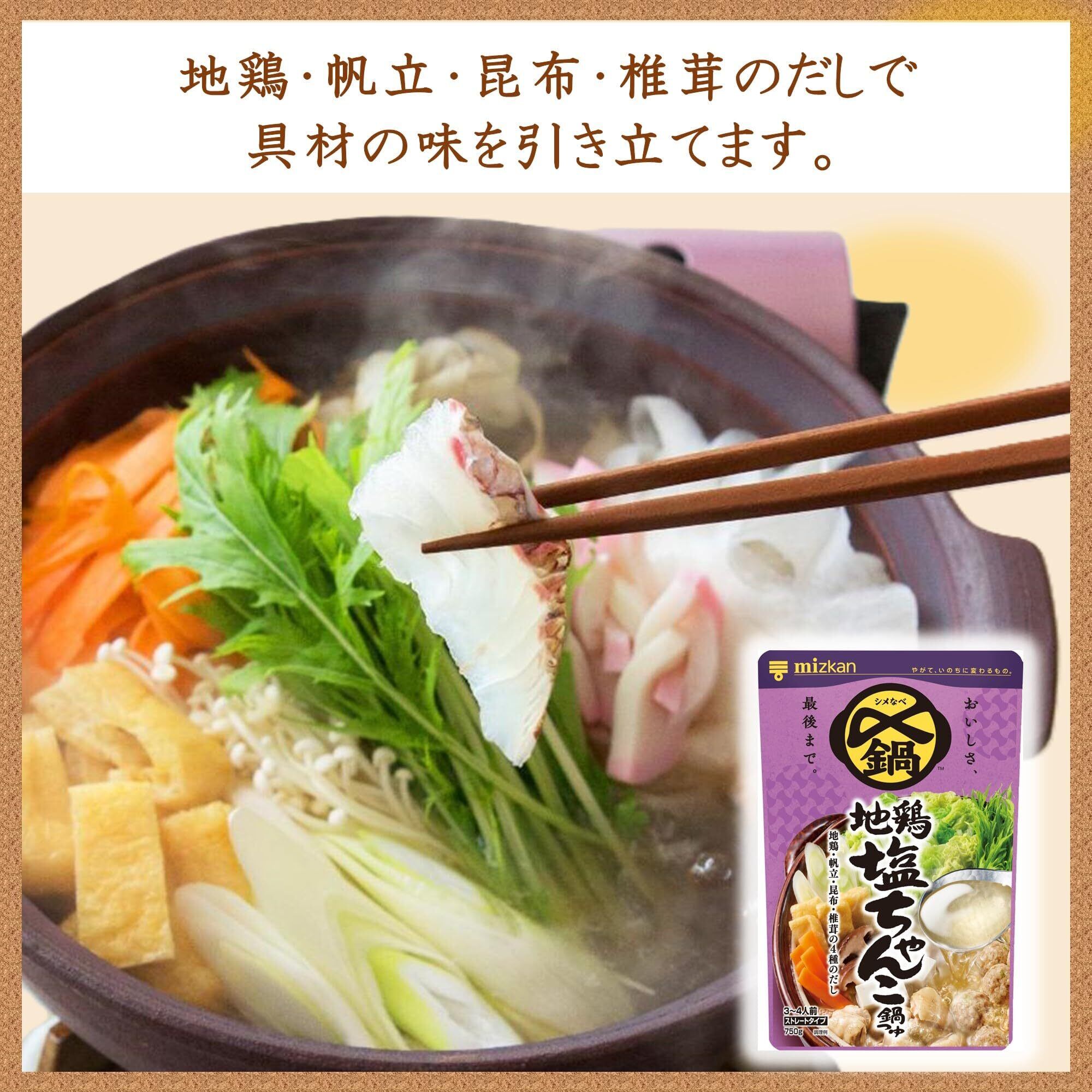 【寄せ鍋】しょうゆ(小麦・大豆を含む)(国内製造)、米発酵調味料、果糖ぶどう糖液糖、食塩、醸造酢、アミノ酸液(大豆を含む)、鶏がらだし、こんぶだし、かつおエキス、ほたてだし、砂糖、酵母エキス、そうだかつおだし、発酵調味料、粉砕かつおぶし/調味料(アミノ酸等)、乳酸【焼あごだし鍋】食塩(国内製造)、水あめ、しょうゆ(小麦・大豆を含む)、焼きあごだし、かつおエキス、さば節だし、アミノ酸液(大豆を含む)、米発酵調味料、酵母エキス、煮干しだし、鶏がらだし、しいたけだし、こんぶだし、発酵調味料/調味料(アミノ酸等)【地鶏塩ちゃんこ鍋】食塩(国内製造)、水あめ、鶏がらだし、アミノ酸液(大豆を含む)、ほたてだし、こんぶだし、コラーゲンペプチド(ゼラチンを含む)、しょうが、香味食用油、しいたけだし、酵母エキス(大豆を含む)、ごま油、こしょう/調味料(アミノ酸等)、増粘剤(キサンタンガム)、香辛料抽出物【地鶏昆布だし鍋】食塩(国内製造)、水あめ、鶏がらだし、こんぶだし、しょうゆ(小麦・大豆を含む)、さば節だし、アミノ酸液(大豆を含む)、かつおエキス、酵母エキス、発酵調味料、香辛料/調味料(アミノ酸等)