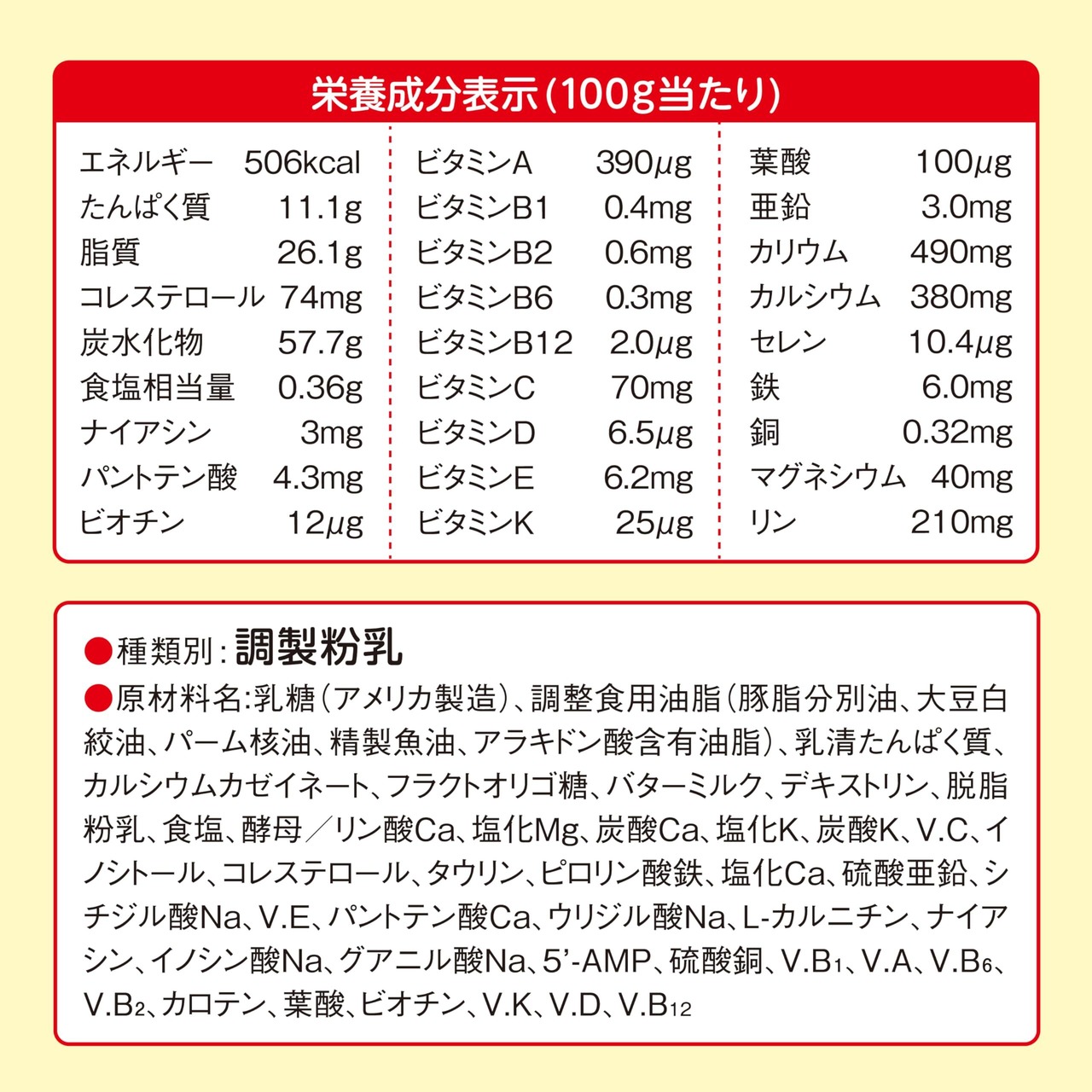 原材料: Ca、塩化Mg、炭酸Ca、塩化K、炭酸K、V.C、イノシトール、コレステロール、タウリン、ピロリン酸鉄、塩化Ca、硫酸亜鉛、シチジル酸Na、V.E、パントテン酸Ca、ウリジル酸Na、L-カルニチン、ナイアシン、イノシン酸Na、グアニル酸Na、5'-AMP、硫酸銅、V.B1、V.A、V.B6、V.B2、カロテン、葉酸、ビオチン、V.K、V.D、V.B12