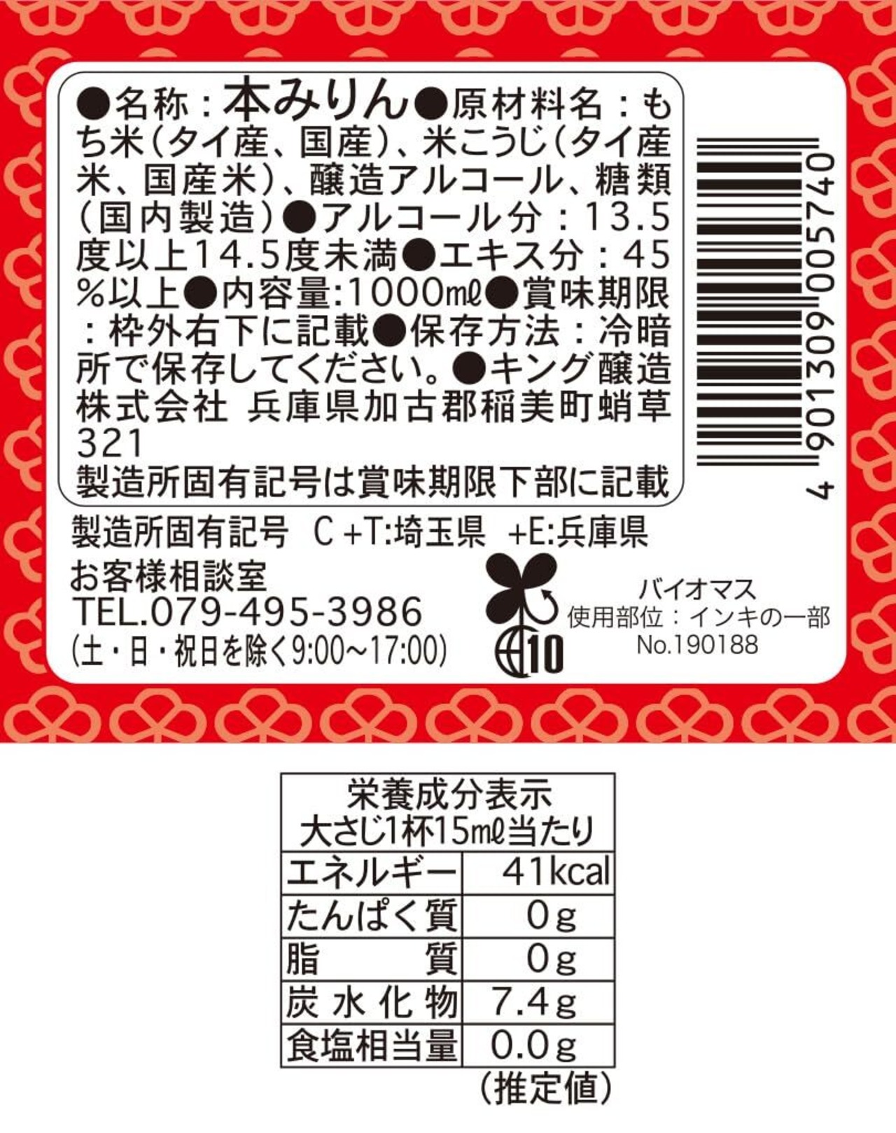 キング醸造 日の出 醇良本みりんペット 兵庫県 1000ml
