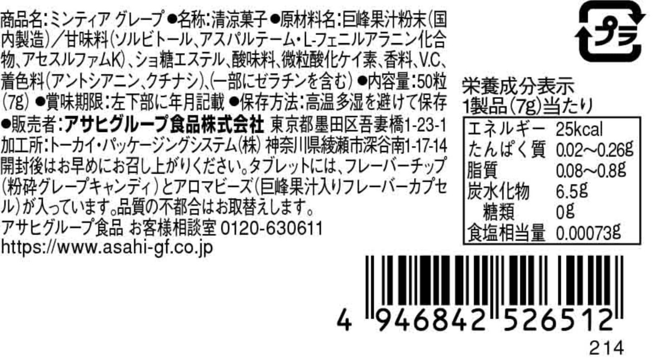 原材料:巨峰果汁粉末/甘味料(ソルビトール、アスパルテーム・L-フェニルアラニン化合物、アセスルファムK)、ショ糖エステル、酸味料、微粒酸化ケイ素、香料、V.C、着色料(アントシアニン、クチナシ)、(一部にゼラチンを含む)
