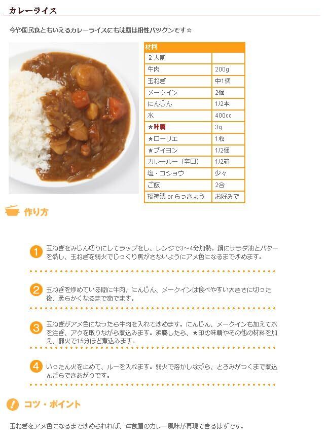 原材料:食塩、肉エキス(ポーク、チキン)、野菜エキス、動植物油脂、砂糖、乳糖、小麦粉、香辛料、調味料(アミノ酸等)