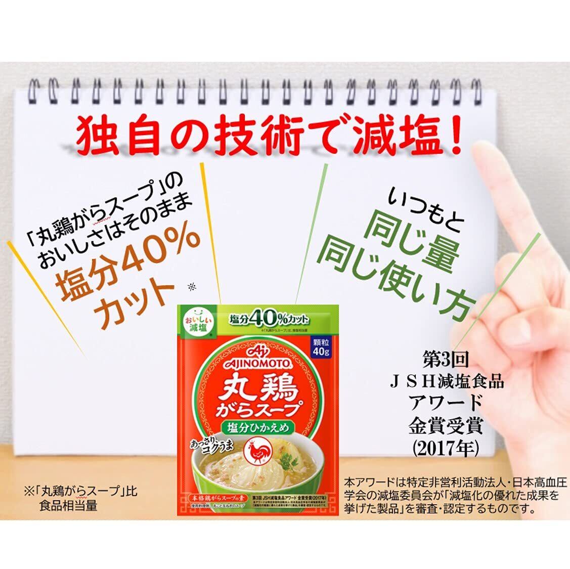 「丸鶏がらスープ」〈塩分ひかえめ〉40g袋は、鶏肉とがらをじっくり煮出した、本格鶏がらスープの素「丸鶏がらスープ」のおいしさはそのままに塩分を40%(※)カットした、本格鶏がらスープの素です。(※「丸鶏がらスープ」比、食塩相当量分)