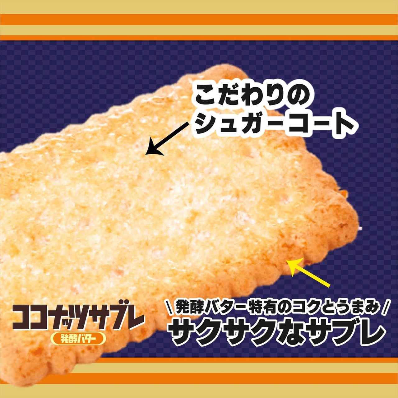 クセになるコク深さと、サクサク食感!「ココナッツサブレ」シリーズは1965年の発売から多くのお客様に愛されるロングセラー商品です。発酵バター特有のコクとうまみを凝縮した濃厚な味わいで、食べだしたらとまらないクセになるおいしさが特徴です。持ち運びにも便利な小分けパックを採用しており、おうち以外でもお召し上がりいただけます。そのまま食べる以外にお菓子作りの材料としてもおすすめです。