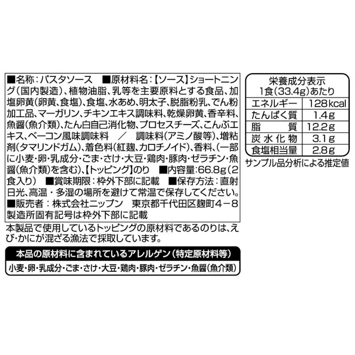 【ソース】ショートニング(国内製造)、植物油脂、乳等を主要原料とする食品、加塩卵黄(卵黄、食塩)、食塩、水あめ、明太子、脱脂粉乳、でん粉加工品、マーガリン、チキンエキス調味料、乾燥卵黄、香辛料、魚醤(魚介類)、たん白自己消化物、プロセスチーズ、こんぶエキス、ベーコン風味調味料 / 調味料(アミノ酸等)、増粘剤(タマリンドガム)、着色料(紅麹、カロチノイド)、香料、(一部に小麦・卵・乳成分・ごま・さけ・大豆・鶏肉・豚肉・ゼラチン・魚醤(魚介類)を含む)、【トッピング】のり