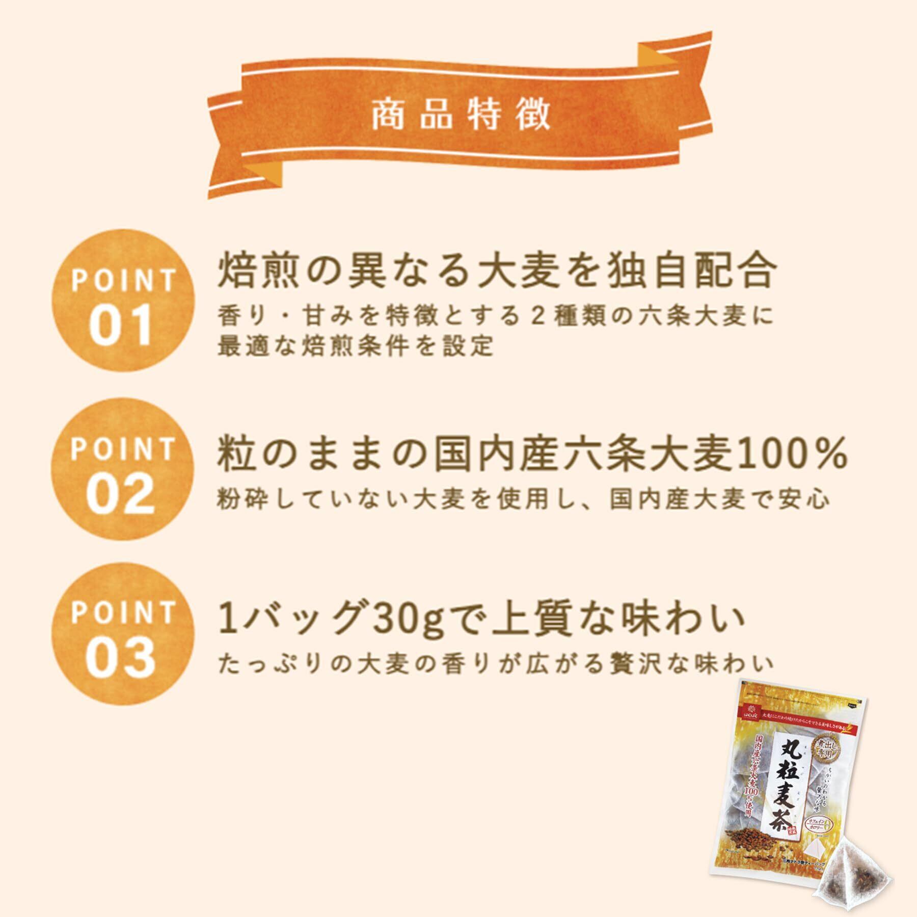 煮出し専用。国内産六条大麦100%使用。麦を贅沢に30g使用することにより、コクがあり香り高い麦茶に仕上げました。また、2種類の六条大麦を独自の配合でブレンドし、ティーバッグには三角テトラ型のティーバッグを採用し抽出効率を高めました。急須で手軽にお飲み頂く事もできます。