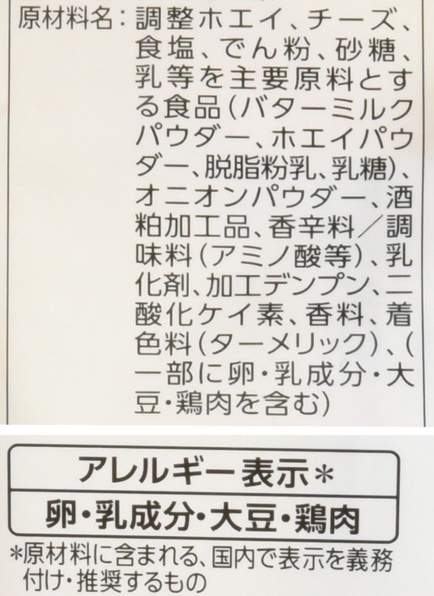 原材料:調整ホエイ、チーズ、食塩、でん粉、砂糖、乳等を主要原料とする食品(バターミルクパウダー、ホエイパウダー、脱脂粉乳、乳糖)、オニオンパウダー、酒粕加工品、香辛料/調味料(アミノ酸等)、乳化剤、加工デンプン、二酸化ケイ素、香料、着色料(ターメリック)、(一部に卵・乳成分・大豆・鶏肉を含む)