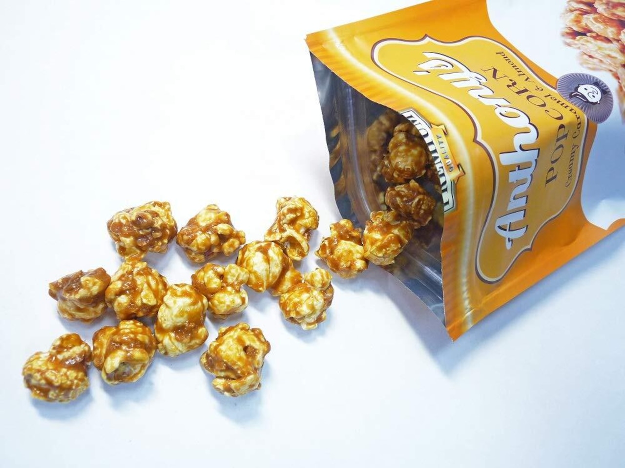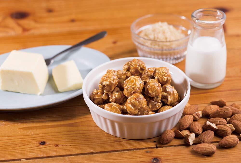 ノンオイルで熱風で仕上げる「エアーポップ製法」のマッシュルーム型ポップコーンを使用し、銅釜でトロトロに煮込んだキャラメルにこんがりローストした皮付きクラッシュアーモンドを加えた蜜で仕上げました。キャラメルのコクのある甘さと香ばしいアーモンドが良く合う後引く美味しさが癖になる逸品です。