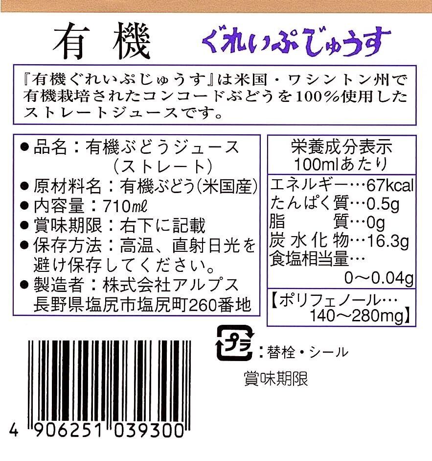 アルプス 有機ぐれいぷじゅうすコンコード 710ml