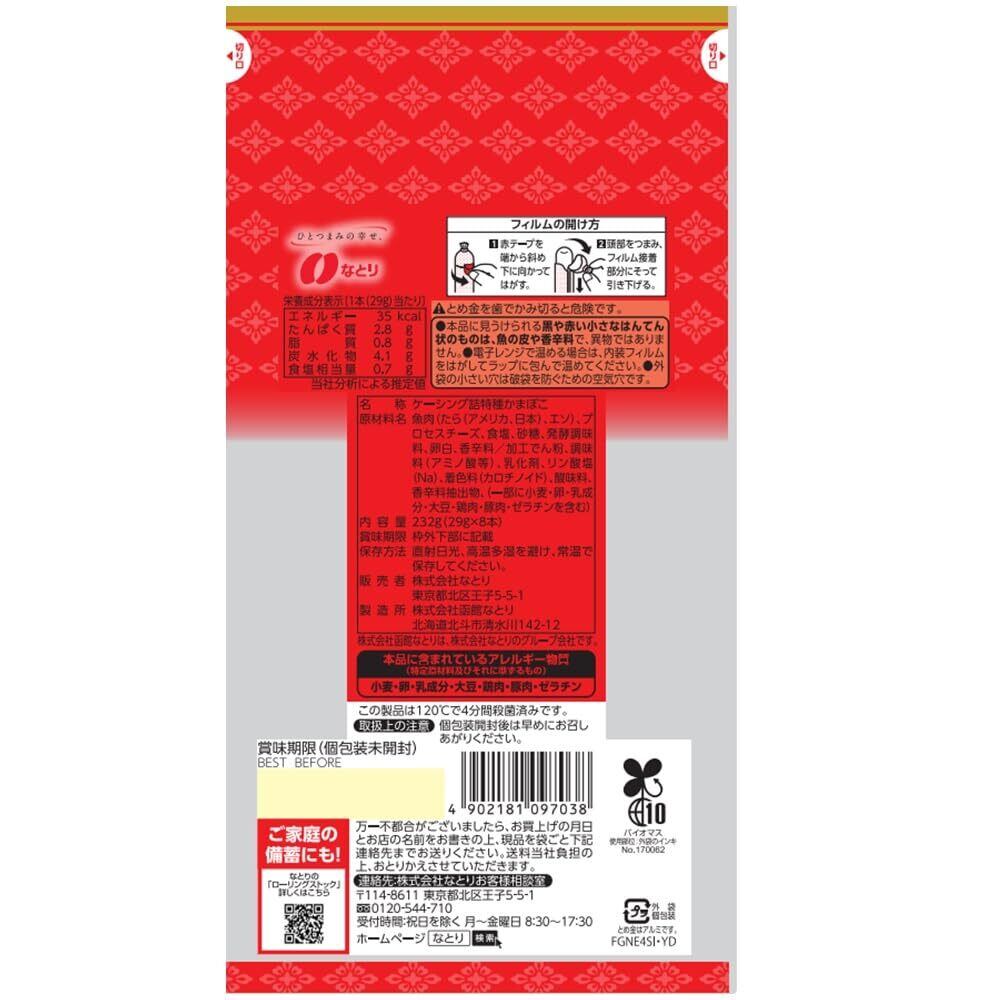 原材料:魚肉(たら(アメリカ、日本)、エソ)、プロセスチーズ、食塩、砂糖、発酵調味料、卵白、香辛料/加工でん粉、調味料(アミノ酸等)、乳化剤、リン酸塩(Na)、着色料(カロチノイド)、酸味料、香辛料抽出物、(一部に小麦・卵・乳成分・大豆・鶏肉・豚肉・ゼラチンを含む)