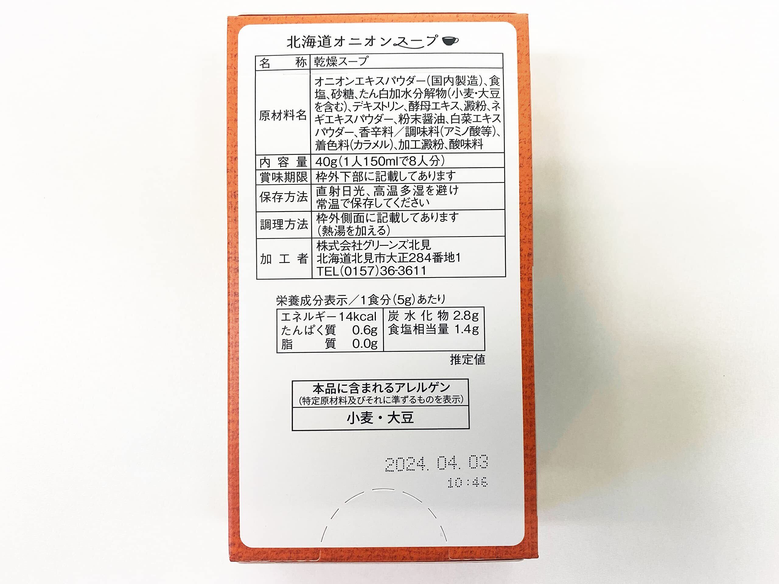 「グリーンズ北見 北海道 オニオンスープ」は、北海道産の新鮮な玉ねぎをふんだんに使用した、香り高く、やさしい味わいのスープです!お湯を注ぐだけで手軽に楽しめるので、忙しい日のランチや軽食にぴったりです。玉ねぎの甘さと旨味がぎゅっと詰まった一杯が、心も体も温めてくれます。