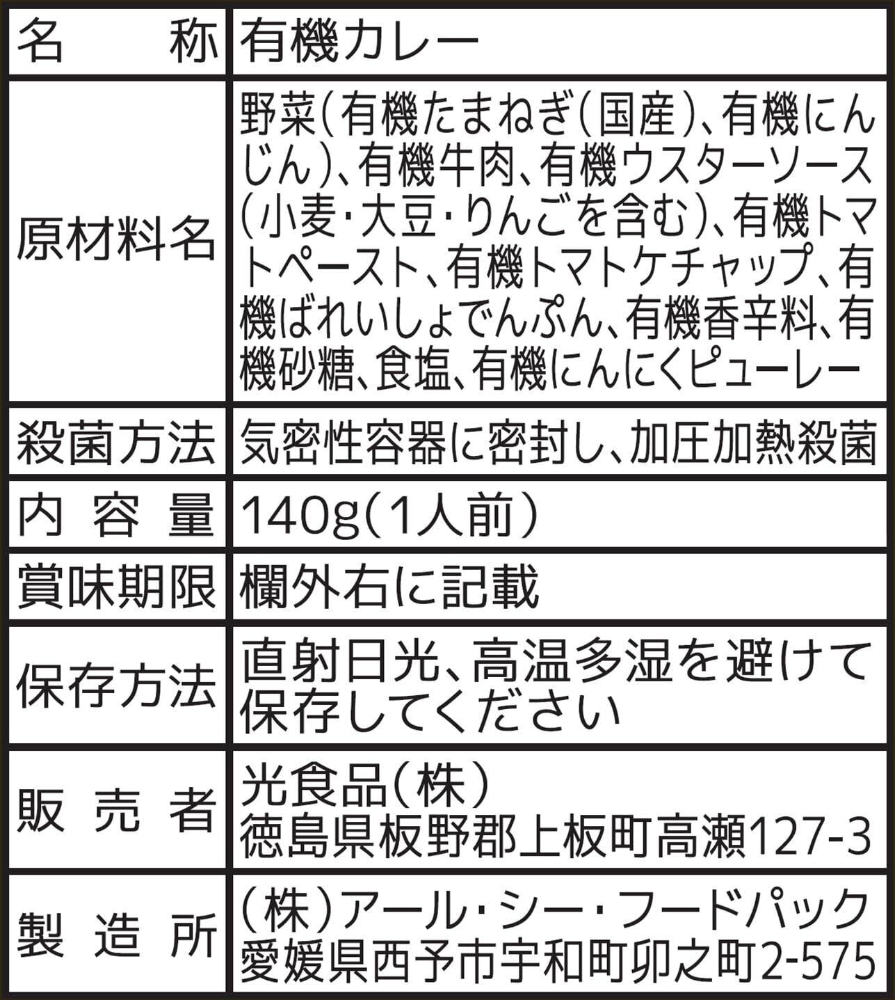 野菜(有機たまねぎ(国産)、有機にんじん)、有機牛肉、有機ウスターソース(小麦・大豆・りんごを含む)、有機トマトペースト、有機トマトケチャップ、有機ばれいしょでんぷん、有機香辛料、有機砂糖、食塩、有機にんにくピューレー