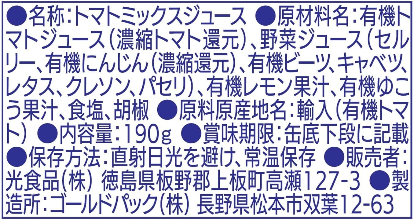 原材料:有機トマトジュース(濃縮トマト還元)、野菜ジュース(セルリー・有機にんじん(濃縮還元)・ビーツ・キャベツ・レタス・クレソン・パセリ)、レモン果汁、有機ゆこう果汁、食塩、胡椒