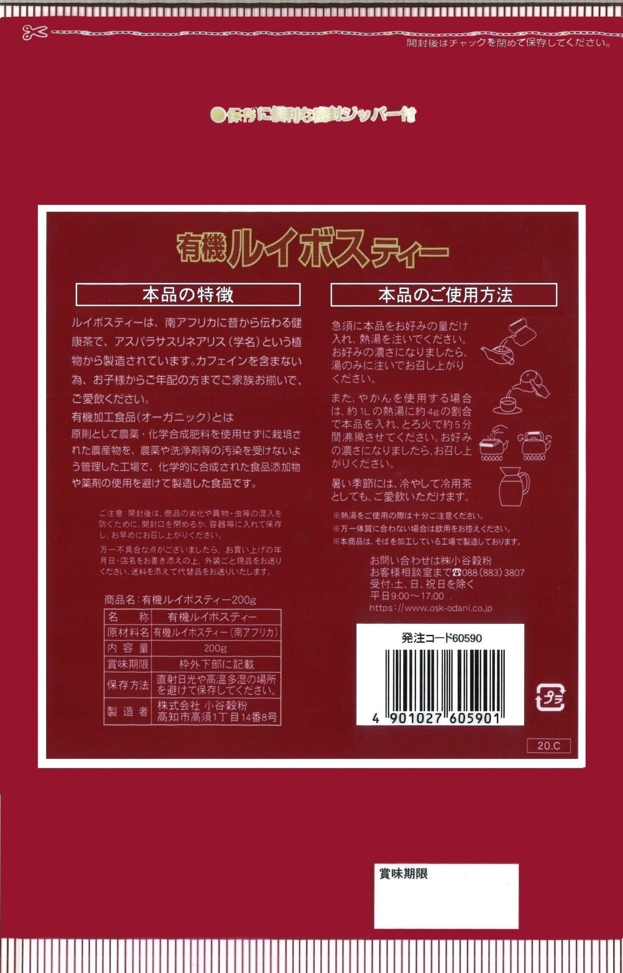 有機栽培された原料を使用した、ルイボス茶。タンニンを含んでいます。