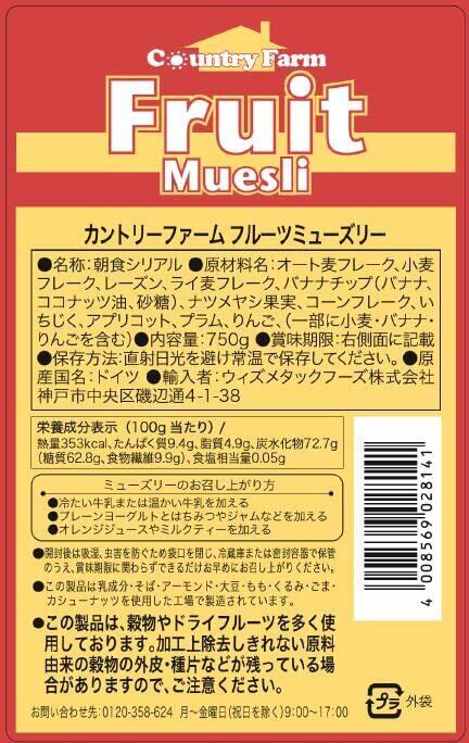 原材料:オート麦フレーク、小麦フレーク、レーズン、ライ麦フレーク、バナナチップ(バナナ、ココナッツ油、砂糖、はちみつ)、ナツメヤシ果実、コーンフレーク(とうもろこし(遺伝子組み換えでない)砂糖、食塩、麦芽エキス)、ライスフレーク、いちじく、桃、プラム、りんご、香料