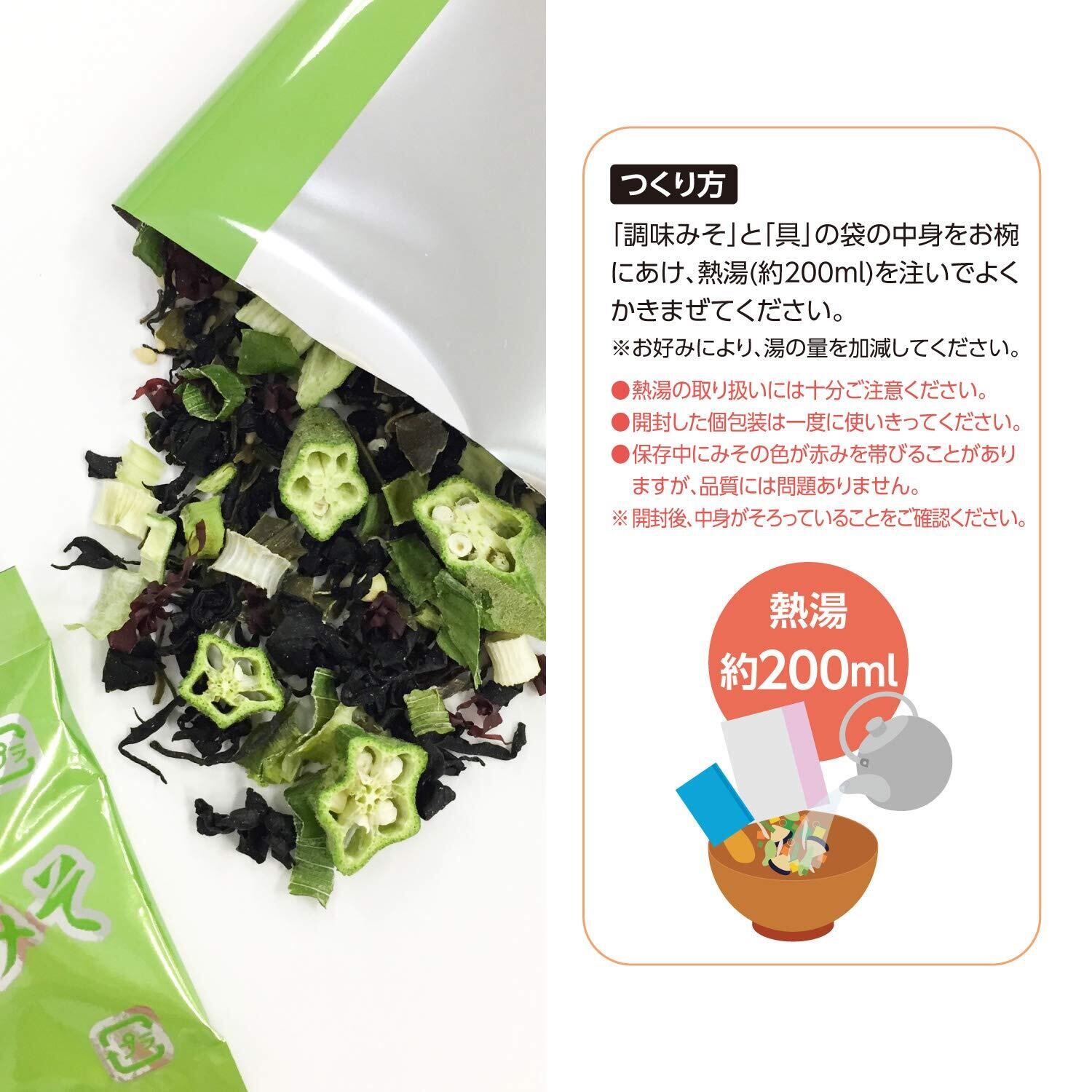 【あげなす汁】調味みそ:米みそ(国内製造)、砂糖、昆布エキス、かつおエキス、かつお節粉末、煮干しエキス、宗田かつお節粉末、煮干し粉末、食塩、酵母エキス/酒精、調味料(アミノ酸等)、ピロリン酸第二鉄、(一部大豆を含む)具:乾燥キャベツ、あげなす、乾燥かぼちゃ、乾燥ごぼう、 乾燥」小松菜、乾燥にんじん、乾燥ねぎ/酸化防止剤(ビタミンE)、(一部に乳成分・大豆を含む) 【ブロッコリー汁】調味みそ:米みそ(国内製造)、砂糖、食塩、乳酸菌末(殺菌乳酸菌体、デキストリン)/酒精、調味料(アミノ酸等)、(一部に乳成分・大豆を含む)具:乾燥キャベツ、乾燥ブロッコリー、コーンパウダー、乾燥にんじん、乾燥コーン、粉末油脂、乾燥オニオン、粉末豆乳、ごま、食塩、ぶどう糖、オニオンパウダー、たんぱく加水分解物、チキンエキスパウダー、酵母 エキス、チーズパウダー、パセリ/調味料(アミノ酸等)、ソルビトール、微粒二酸化ケイ素、(一部に乳成分・ごま・大豆・鶏肉を含む)【オクラ汁】調味みそ:米みそ(国内製造)、食塩、かつお節粉末、砂糖、かつおエキス、昆布エキス/調味料(アミノ酸等)、酒精、焼成カルシウム、(一部に大豆を含む)具:わかめ、ごま、乾燥オクラ、めかぶ、昆布、ひじき、赤つのまた、乾燥ねぎ、(一部にごまを含む)