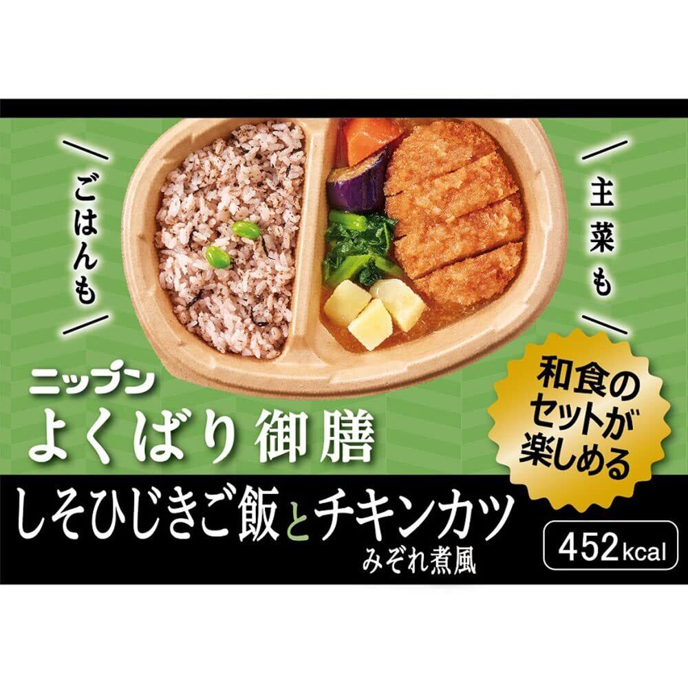 「冷凍 ニップン よくばり御膳 しそひじきご飯とチキンカツみぞれ煮風」は、栄養満点でバランスの取れたお食事を手軽に楽しめる一品です!しそとひじきの香り豊かなご飯と、ジューシーなチキンカツを大根おろしとともに煮込んだ絶妙なコンビネーションが魅力です。忙しい日のランチやディナーに便利です!