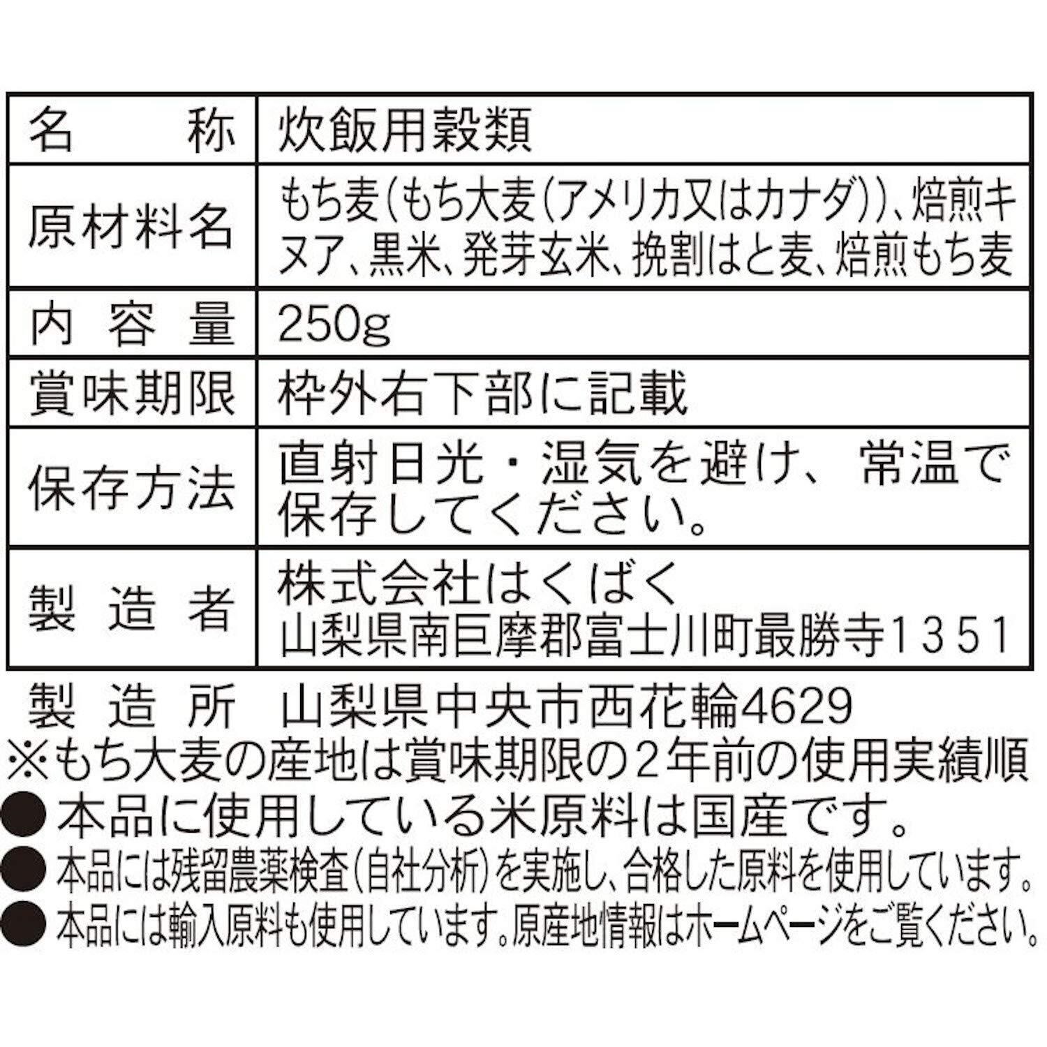 原材料:大麦(もち麦)、焙煎キヌア、黒米、発芽玄米、はと麦、大麦(焙煎もち麦)