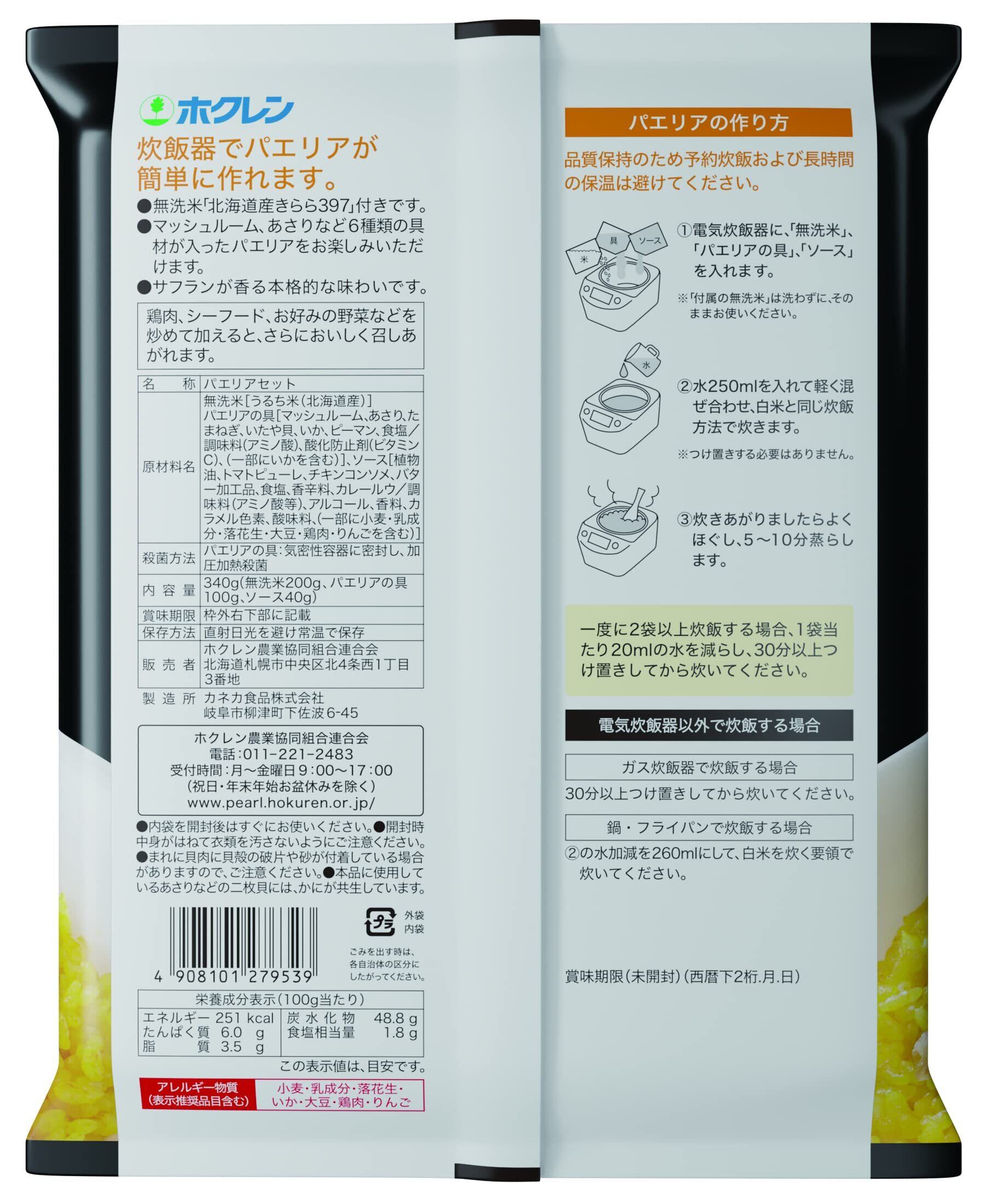 北海道米無洗米(きらら397)と、具材、サフランソースがセットになっている、パエリアセットです。マッシュルーム、あさり、たまねぎ、いたや貝、いか、ピーマンの6種類の具材が入っており、炊飯器にセットして頂いて、お水を加えて炊き上げて頂くだけで、簡単にパエリアをお楽しみいただけます。サフランが香る本格的な味わいです。 原材料・成分 原材料:無洗米〔うるち米(北海道産)〕、パエリアの具〔マッシュルーム、あさり、たまねぎ、いたや貝、いか、ピーマン、食塩/調味料(アミノ酸)、酸化防止剤(ビタミンC)、(一部にいかを含む)〕、ソース〔植物油、トマトピューレ、チキンコンソメ、バター加工品、食塩、香辛料、カレールウ/調味料(アミノ酸等)、アルコール、香料、カラメル色素、酸味料、(一部に小麦、乳成分、落花生、大豆、豚肉、りんごを含む)〕 使用方法 電気炊飯器に、「無洗米」、「パエリアの具」、「ソース」を入れます。※「付属の無洗米」は洗わずに、そのままお使いください。水250mlを入れて軽く混ぜ合わせ、白米と同じ炊飯方法で炊きます。※つけ置きする必要はありません。炊きあがりましたらよくほぐし、5~10分蒸らします。 続きを見る