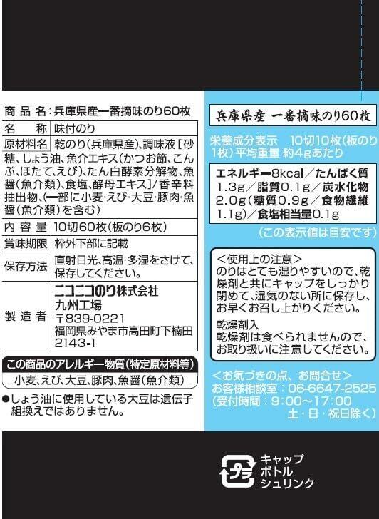 乾のり(兵庫県産)、調味液砂糖、しょう油、魚介エキス(かつお節、こんぶ、ほたて、えび)、たん白酵素分解物、魚醤(魚介類)、食塩、酵母エキス/香辛料抽出物、(一部に小麦・えび・大豆・豚肉・魚醤(魚介類)を含む)