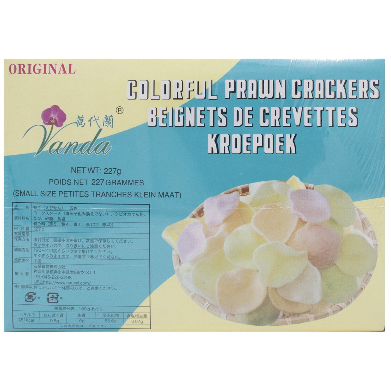 原材料:コーンスターチ、タピオカでん粉、えび、砂糖、食塩、着色料(赤黄5、黄4、青1、赤102、赤40)
