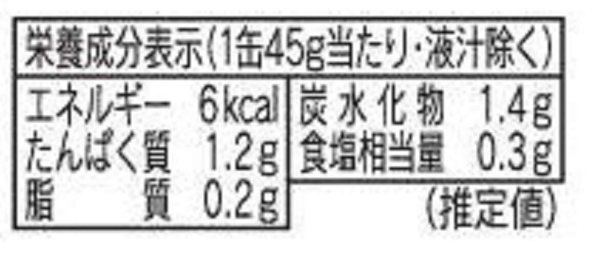 1缶45g当り(液汁除く):エネルギー 5kcal、たんぱく質 1.0g、脂質 0.1g、炭水化物 1.5g、ナトリウム 110mg